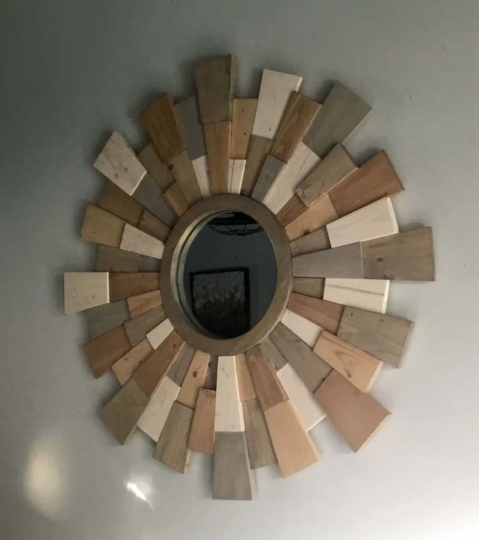 This beautiful sunburst mirror was designed and created to portray a vintage yet very modern look. With its broken up dimensional pieces and scattered multi- colored wood tones, this piece definitely grabs your attention. Its smooth, sleek finish and crisp square edges add to its modern charm.