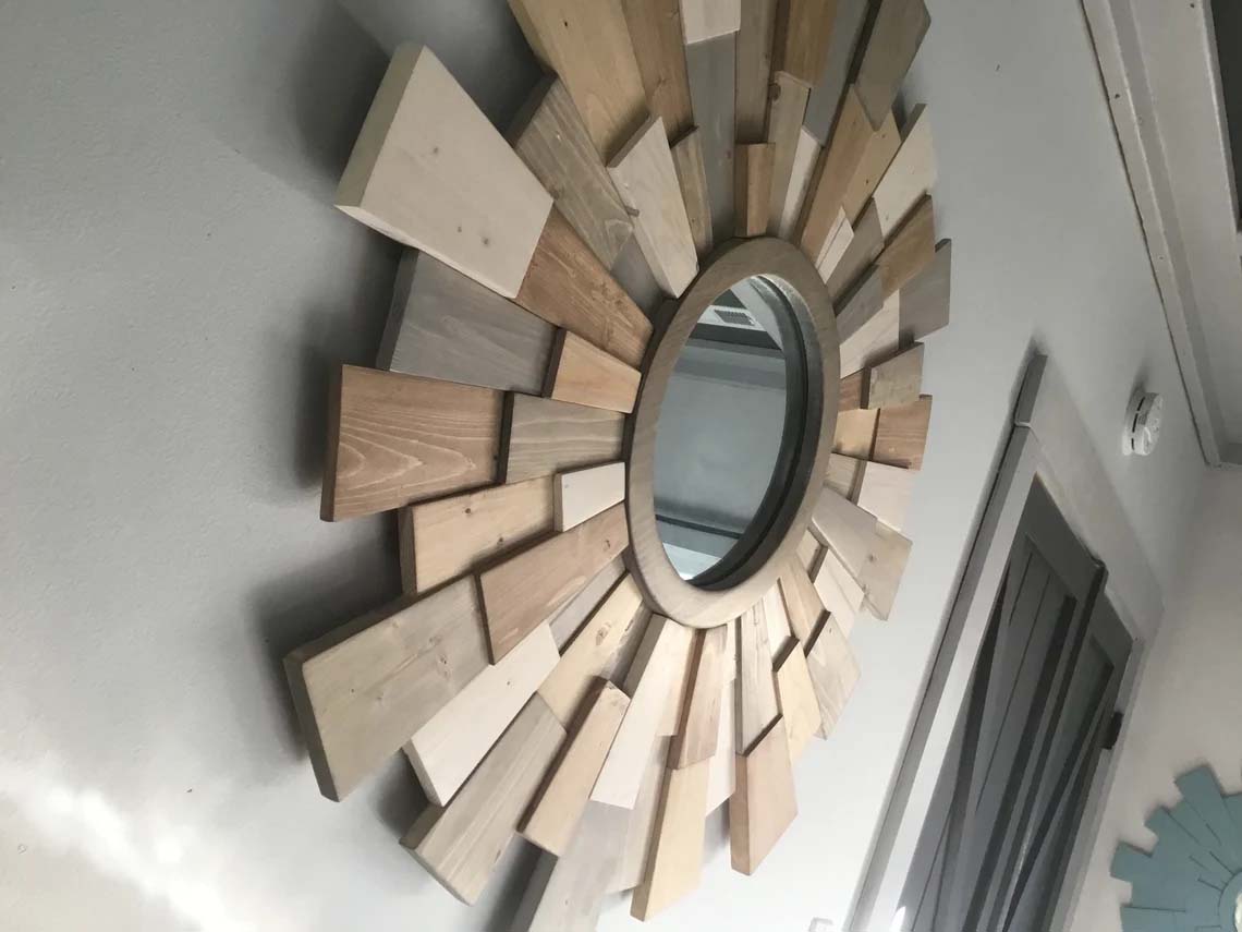This mirror is 38 “ in total diameter and has a 12''mirror in it's center, it would make a beautiful addition to any wall space. If you are interested in a custom mirror please contact us.