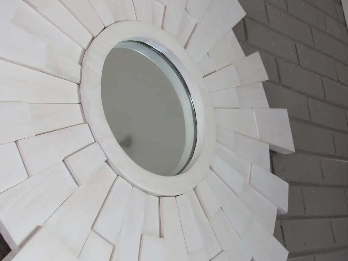 This beautiful whitewashed sunburst mirror was designed and created to portray a vintage yet very modern look. With its broken up dimensional pieces and scattered semi-transparent wood tones, this piece definitely grabs your attention. Also,it's smooth, sleek finish and crisp square edges add to its modern charm.