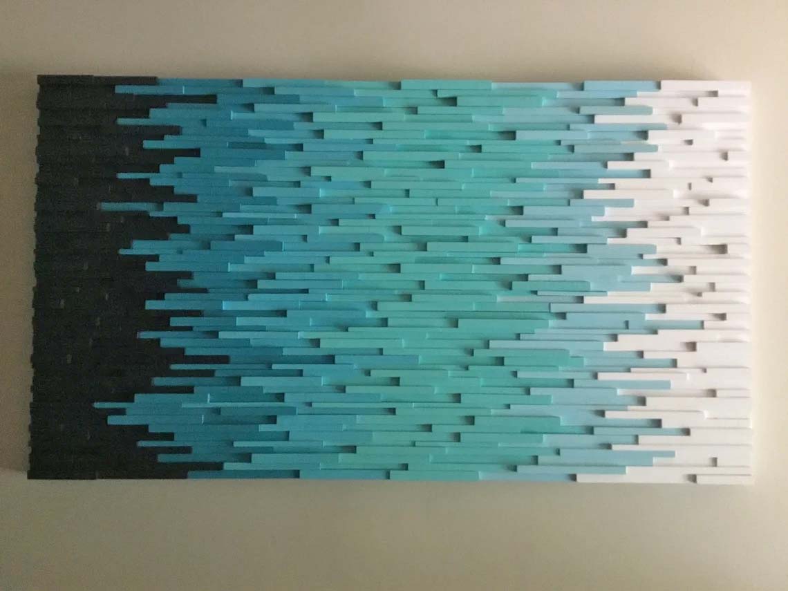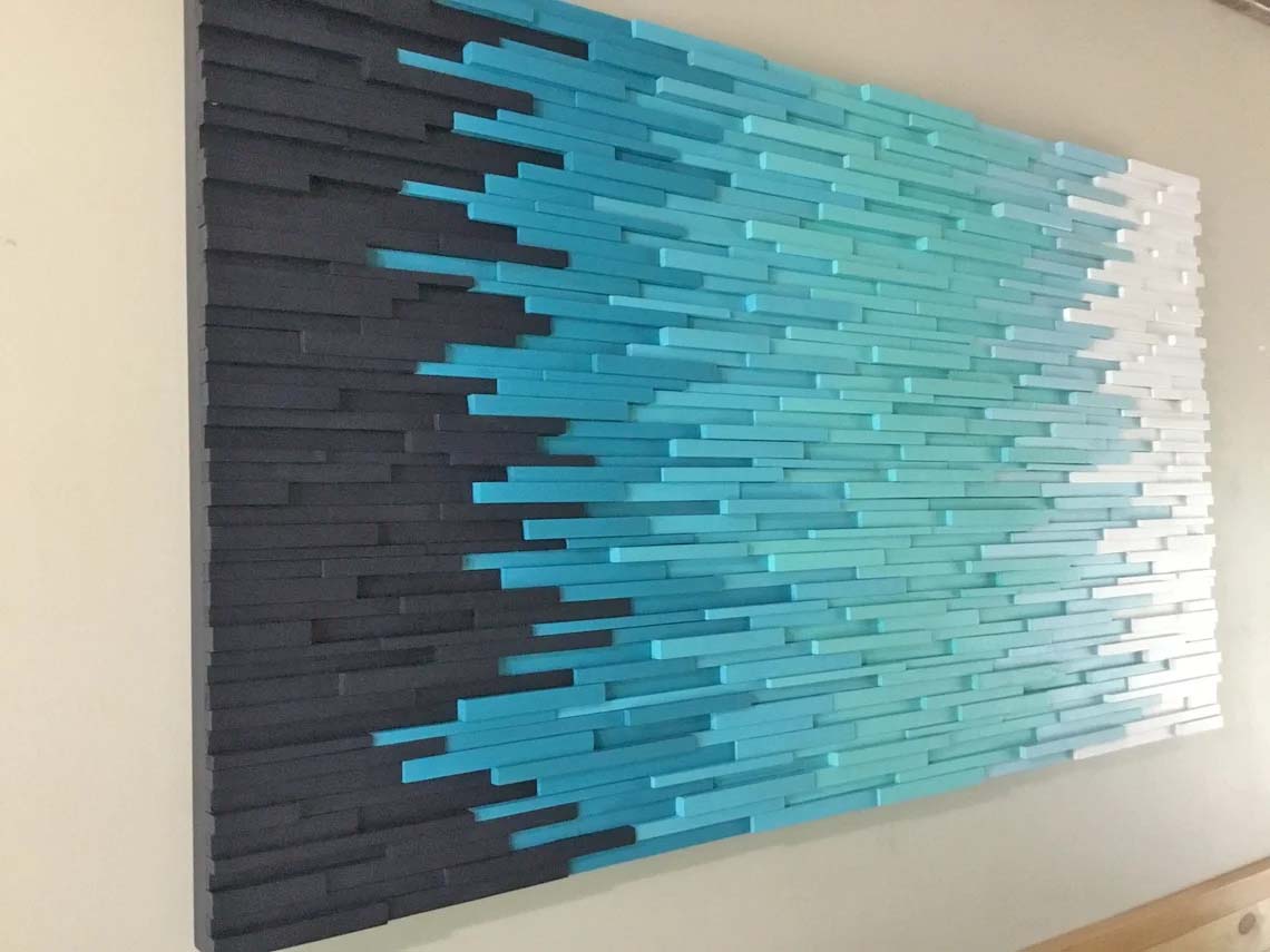 This is a handcrafted modern wood wall art piece that is made out of reclaimed and up cycled wood. To achieve this sculpture each piece of wood had to be individually ripped, cut, sanded, painted and assembled. This piece would be the focal point of any space whether it be home or office. This piece was painted in a Ombre style starting with a dark shade of blue fading to white. This piece would look great in various sequences of colors.