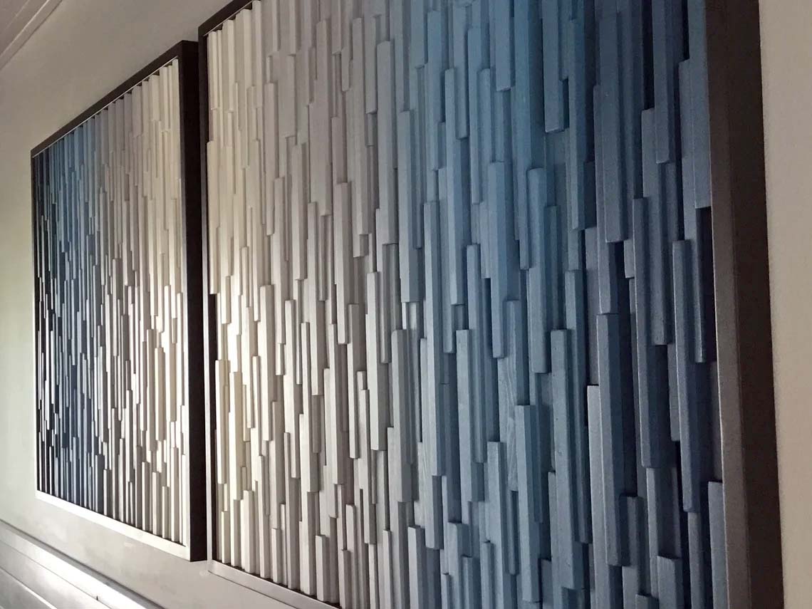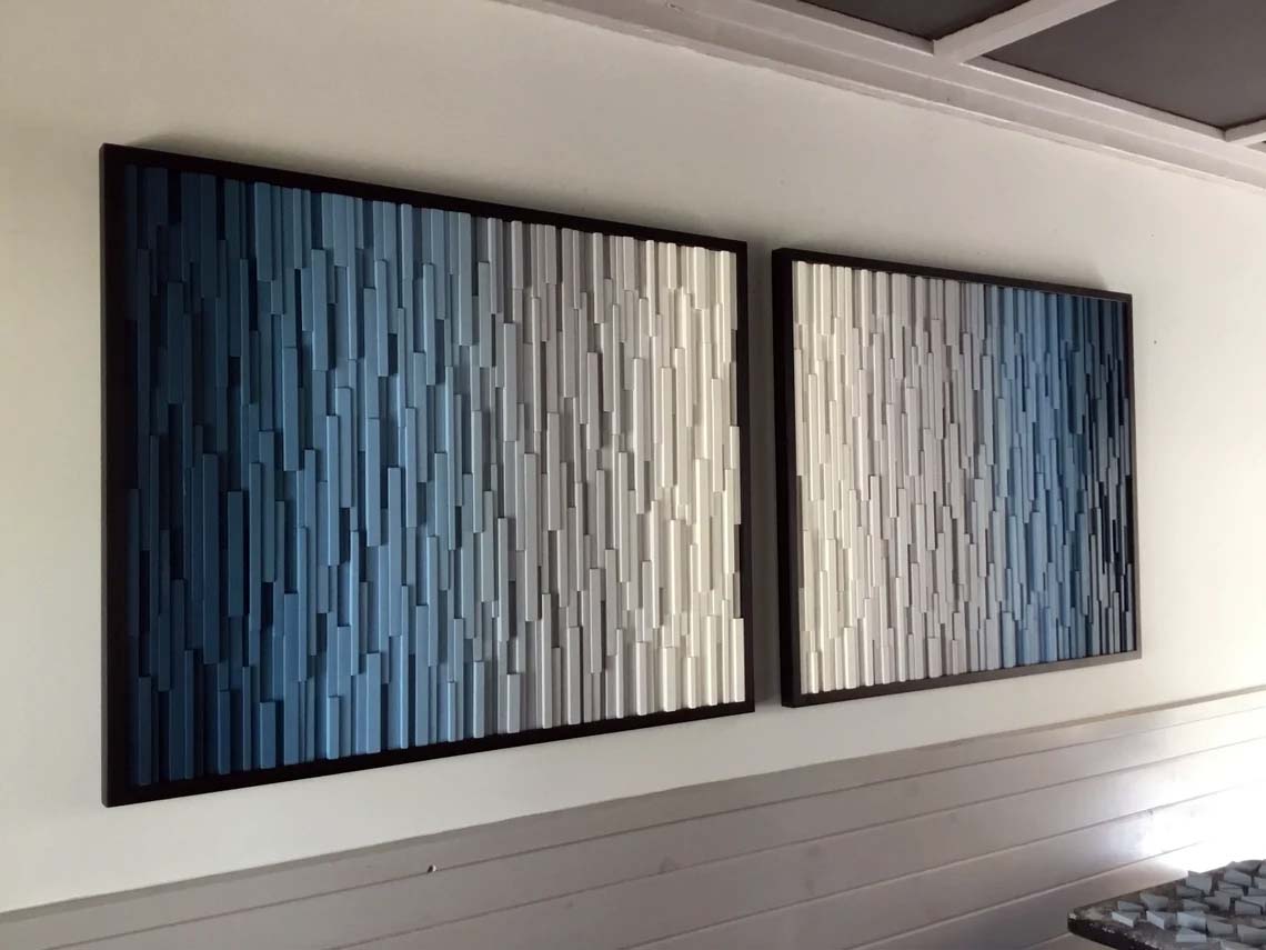 Handcrafted modern two piece wood wall art sculpture that is made from reclaimed and upcycled wood. To achieve this sculpture each piece of wood had to be individually ripped, cut, sanded, painted and assembled. This piece would be the focal point of any space whether it be home or office.
