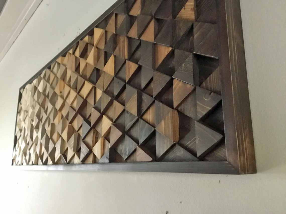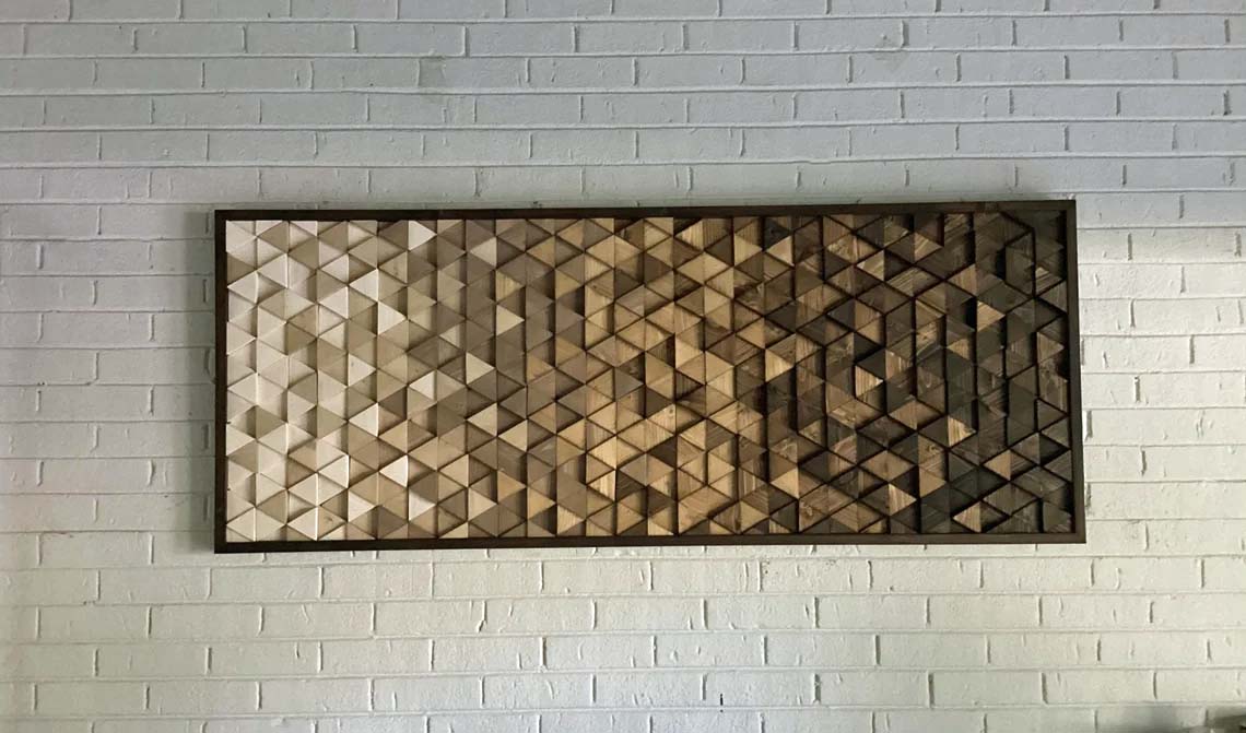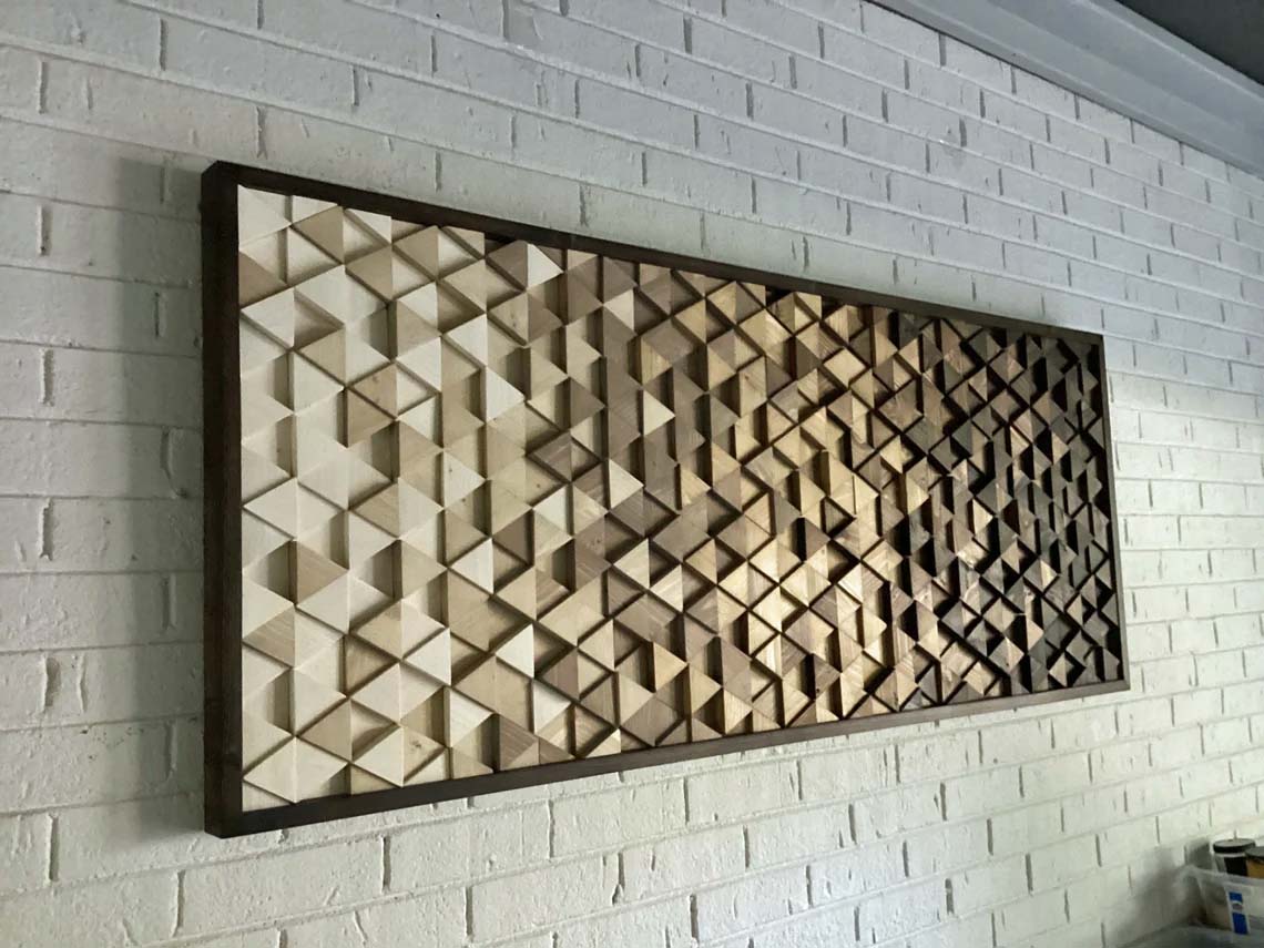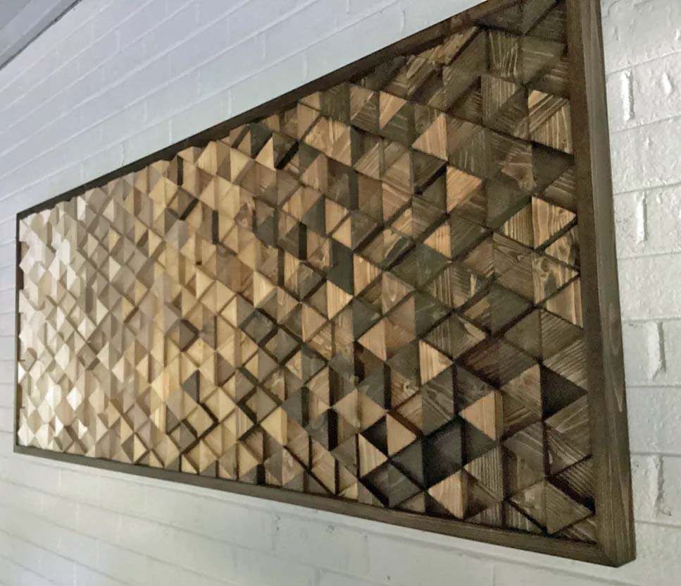 This beautiful geometric wood wall sculpture is composed of multi dimensional cut triangles placed into the design and colored with gradient tones natural brown wood tones and white also finished with a handcrafted expresso brown frame. This piece could also be customized in regards to size and color modification. Feel free to contact.