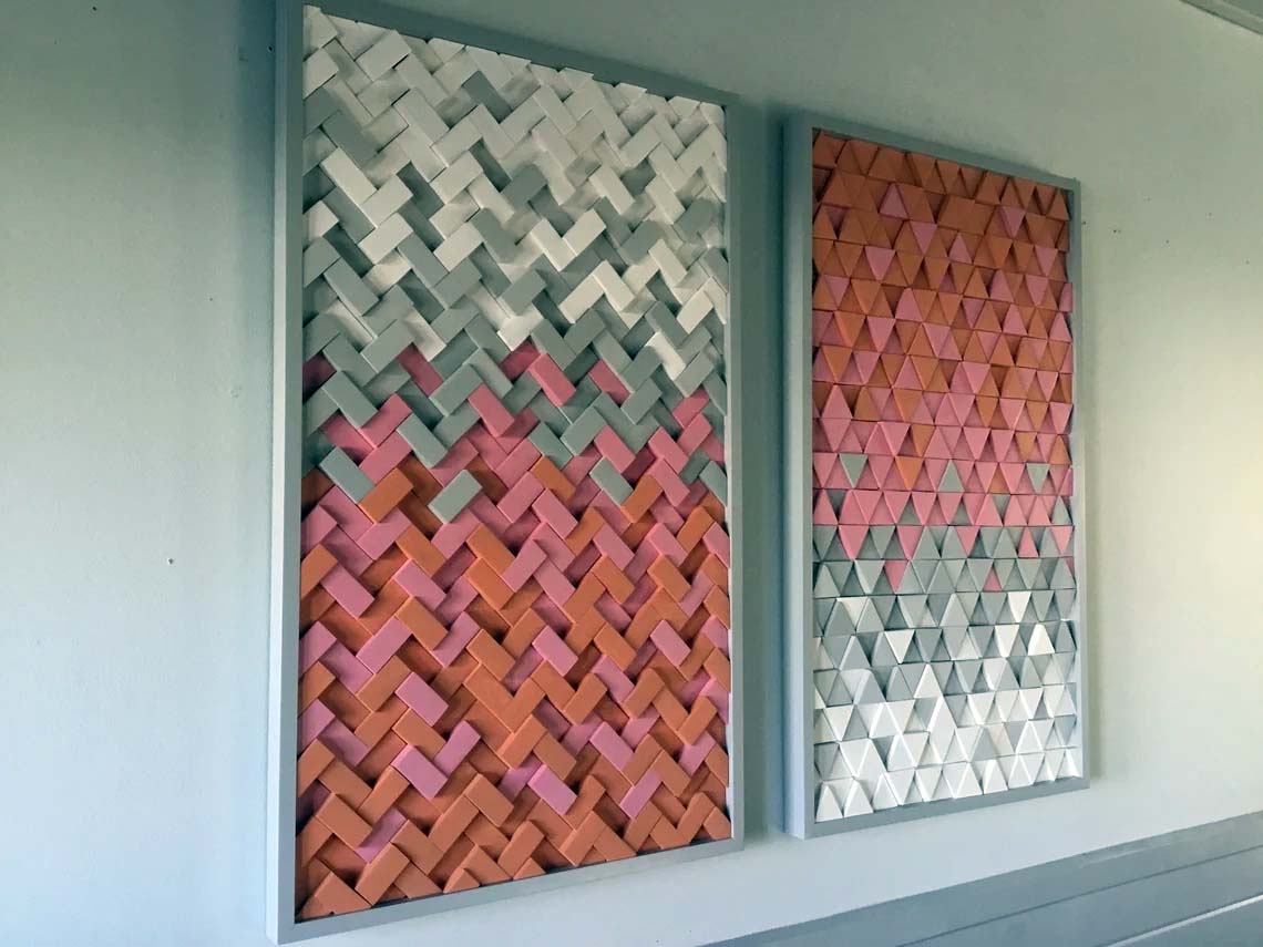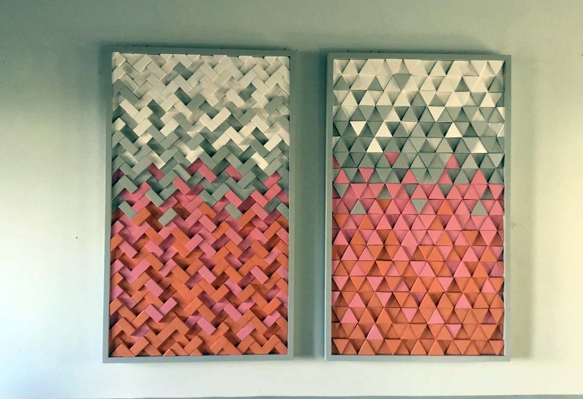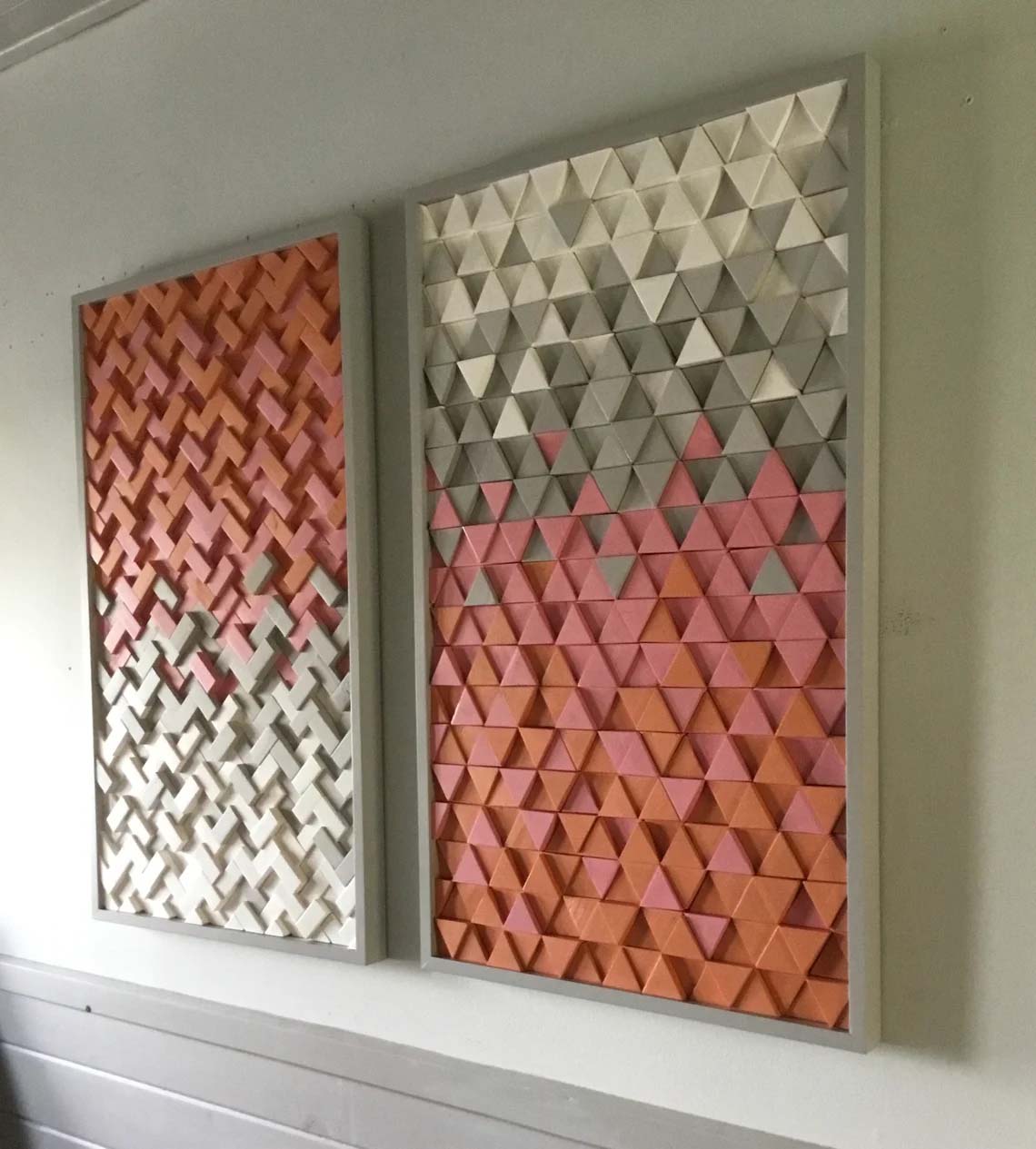 This handcrafted 2pc set includes 1 herringbone design sculpture and 1 triangle design sculpture both incorporating color tones of orange,pink, gray and white, finished off with handmade gray painted frames. These designs are fully customizable in size and color tones as well, feel free to contact with any questions you may have.