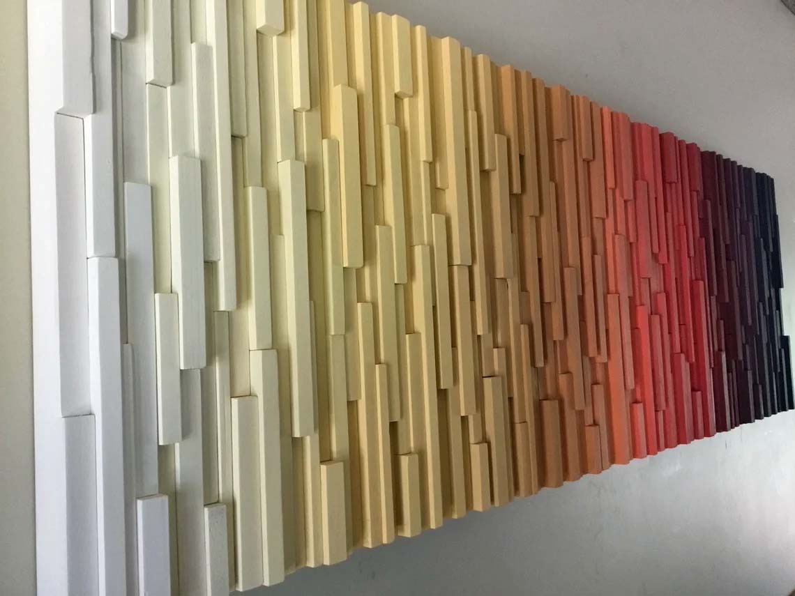 This is a handcrafted modern wood wall art piece that is made out of reclaimed and up cycled wood.To achieve this sculpture each piece of wood had to be individually ripped, cut, sanded, painted and assembled.This piece would be the focal point of any space whether it be home or office.