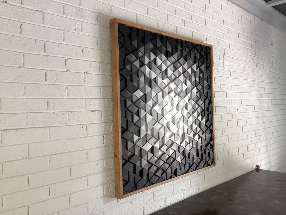 This beautiful geometric wood wall sculpture is composed of multi dimensional cut triangles placed into the design and colored with gradient tones of white , grays and black finished of with an organic warm brown stained frame. This piece could also be customized in regards to size and color modifications, so feel free to contact!