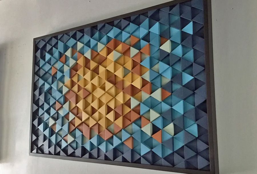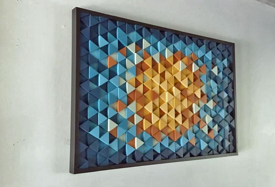 This beautiful geometric wood wall sculpture is composed of multi dimensional cut triangles placed into the design and colored with gradient tones of gold, orange, green and series of blues , finished off with a hand crafted solid black frame. This piece could also be customized in regards to size and color modification.