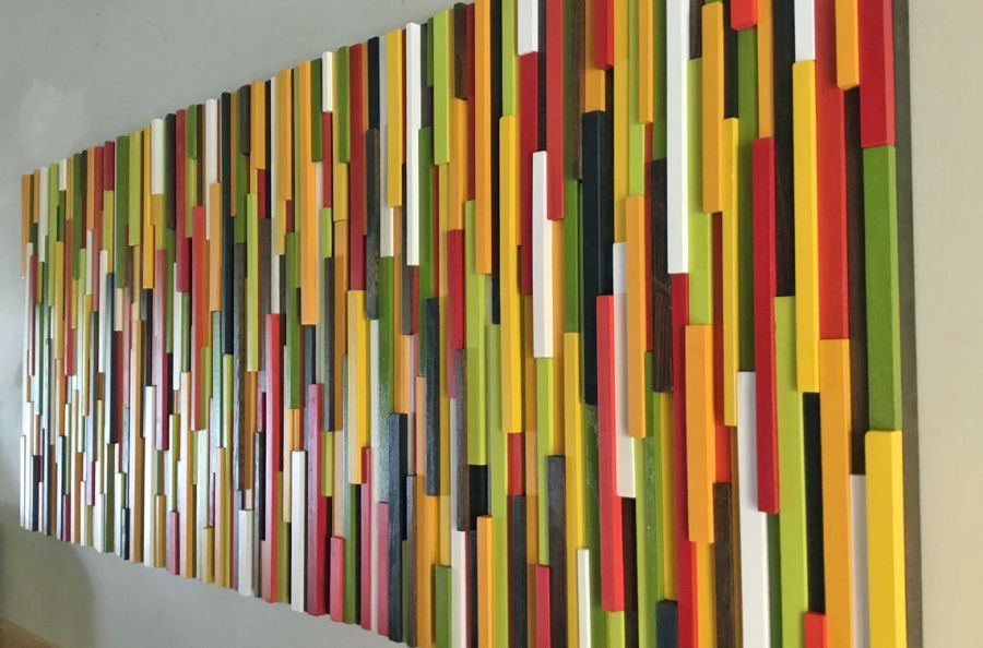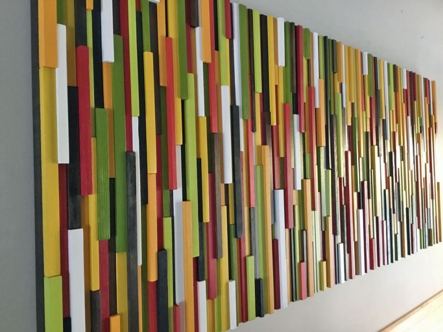 This amazing wall sculpture was made incorporating a mid century modern color palette with color tones of red, yellow, orange, green, black, white, and dark brown stain.