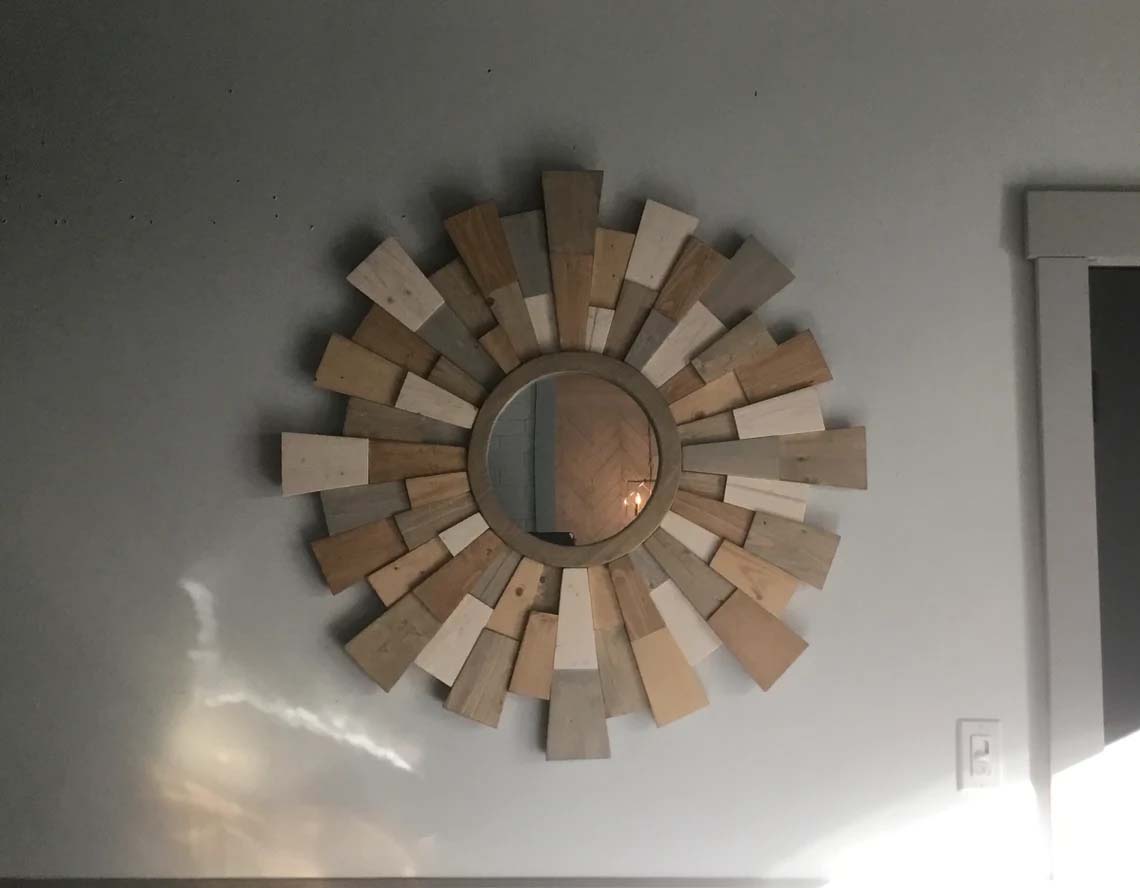 This beautiful sunburst mirror was designed and created to portray a vintage yet very modern look. With its broken up dimensional pieces and scattered multi- colored wood tones, this piece definitely grabs your attention. Its smooth, sleek finish and crisp square edges add to its modern charm.