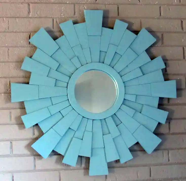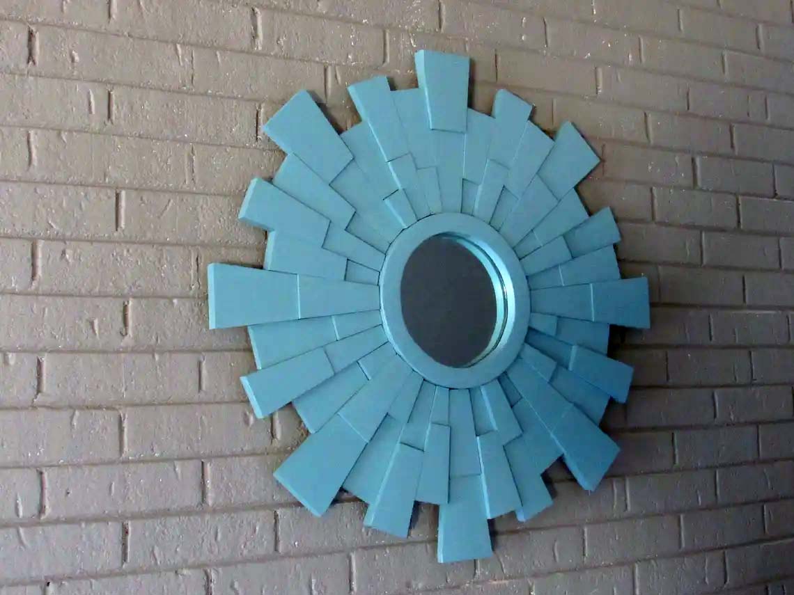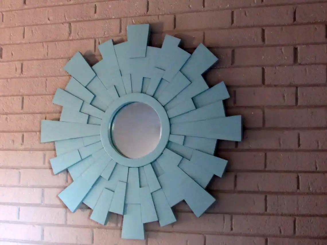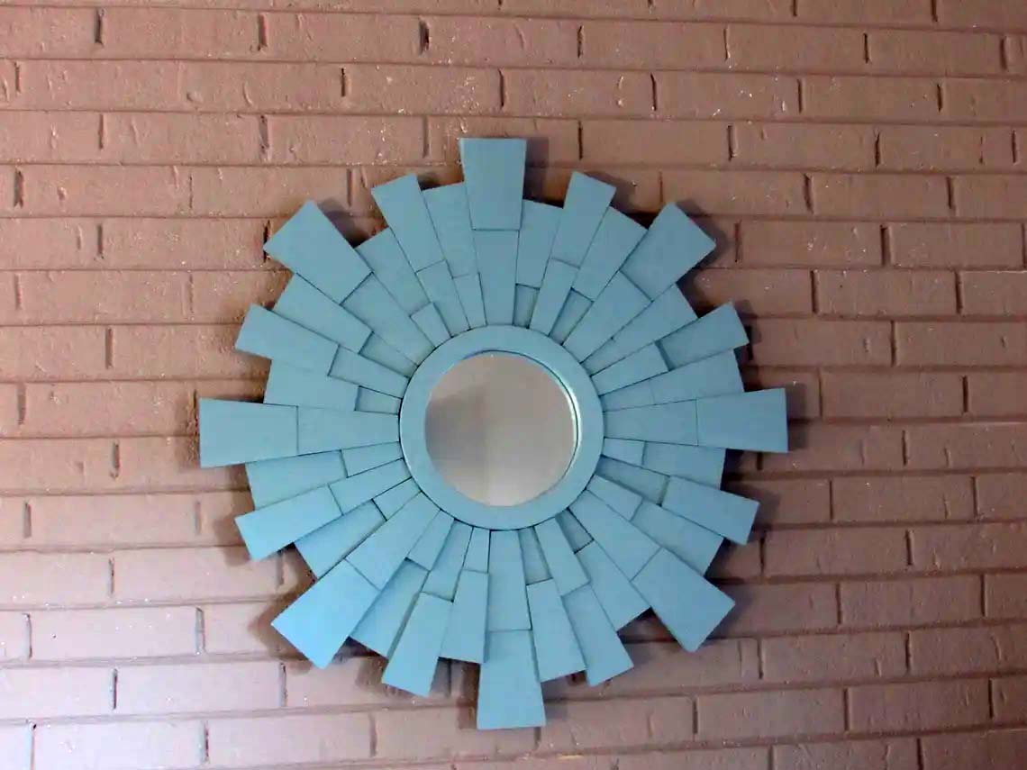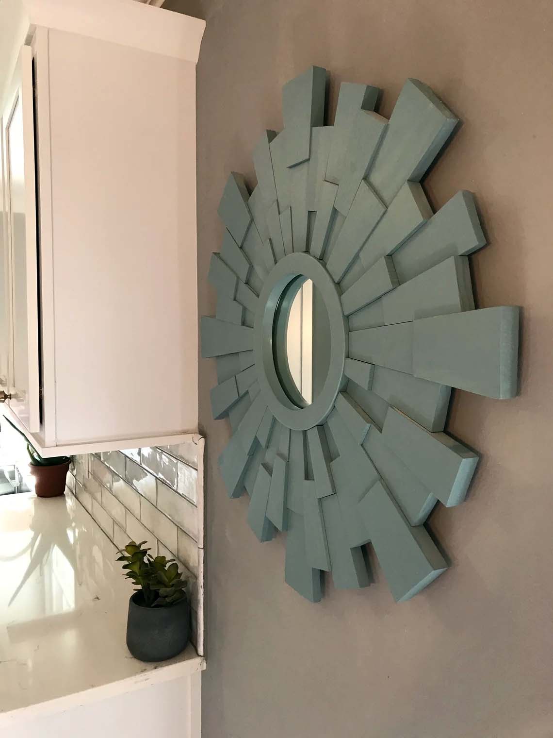 This beautiful seaglass blue sunburst mirror was designed and created to portray a vintage yet very modern look. With its broken up dimensional pieces and yet subtle satin finish, this piece definitely grabs your attention. Its smooth, sleek finish and crisp square edges add to its modern charm.