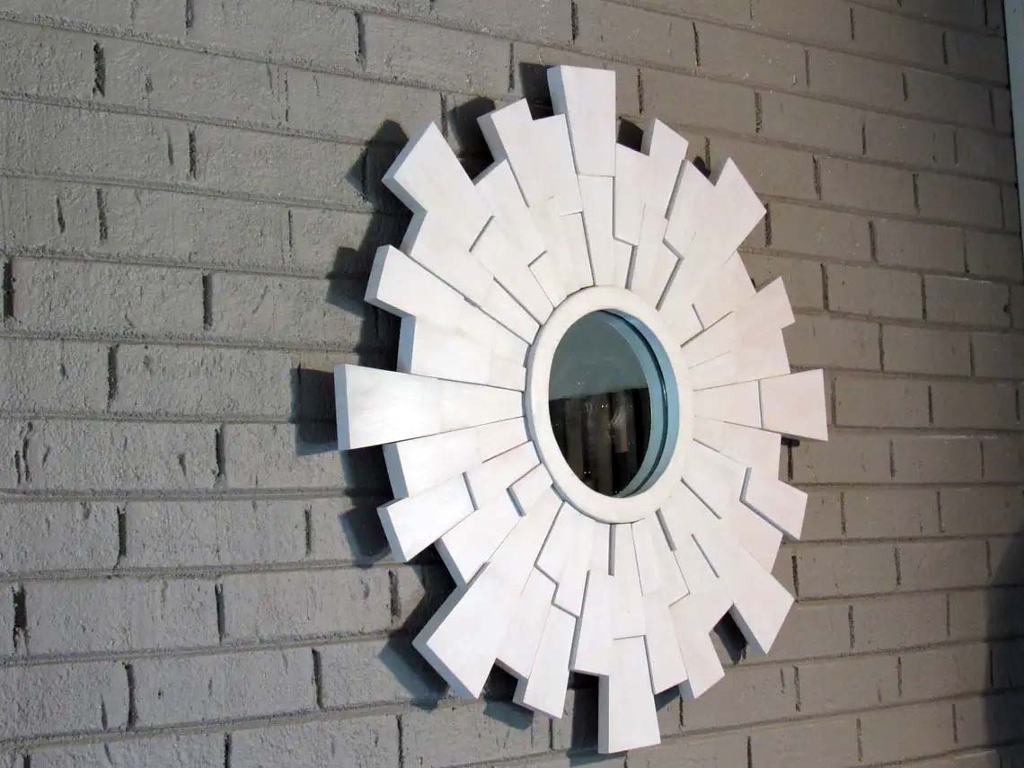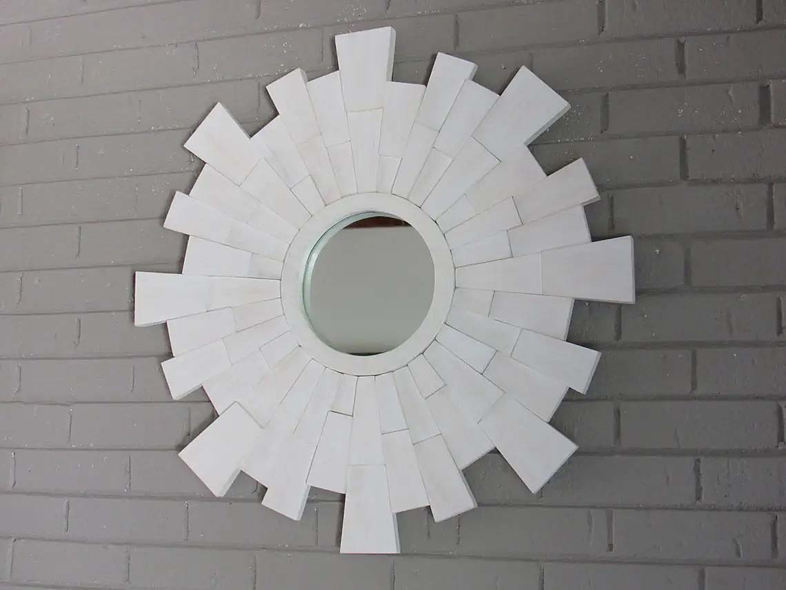 This beautiful whitewashed sunburst mirror was designed and created to portray a vintage yet very modern look. With its broken up dimensional pieces and scattered semi-transparent wood tones, this piece definitely grabs your attention. Also,it's smooth, sleek finish and crisp square edges add to its modern charm.