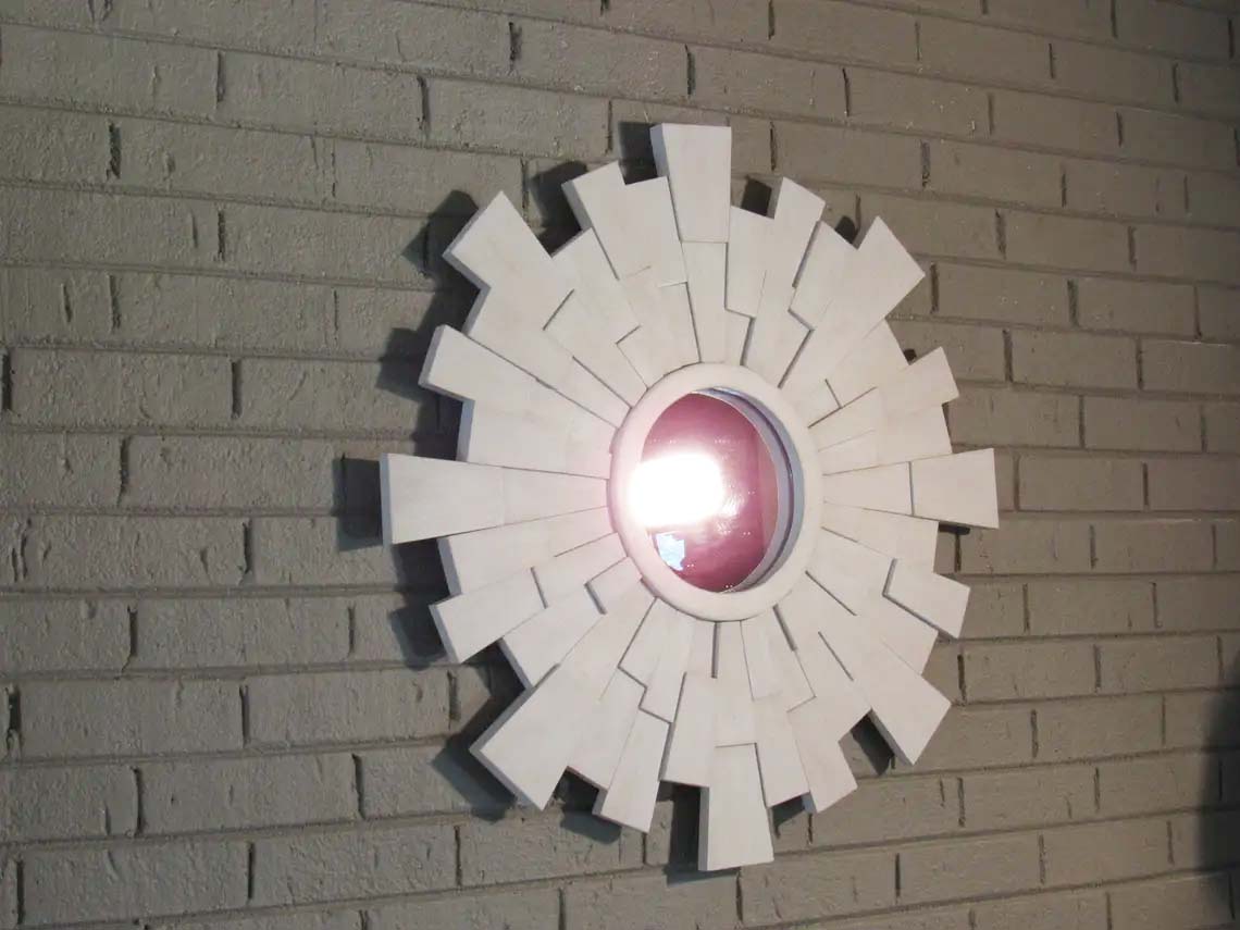 variation of distress, if any, and size can be altered.This sunburst is 28'' in total diameter and has a 8''mirror in it's center, it would make a beautiful addition to any wall space. If you are interested in a custom mirror please contact us.