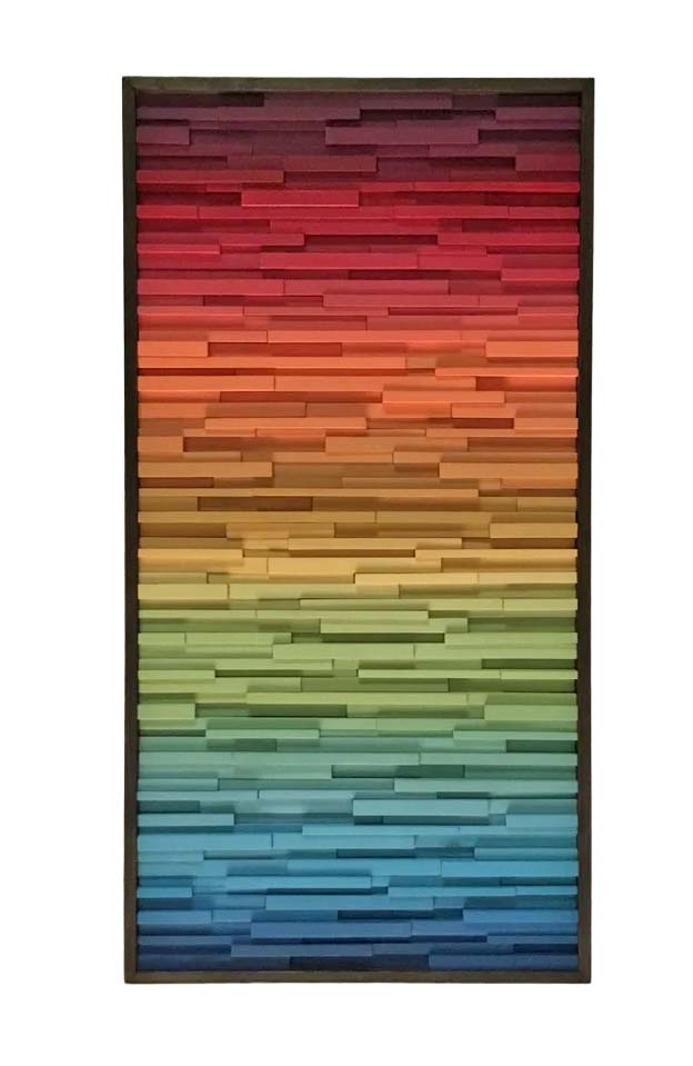 Handcrafted modern wood wall art piece that is made out of reclaimed and up cycled wood. To achieve this sculpture each piece of wood had to be individually ripped, cut, sanded, painted and assembled. This piece would be the focal point of any space whether it be home or office.