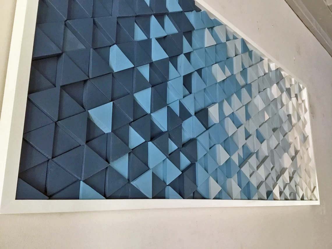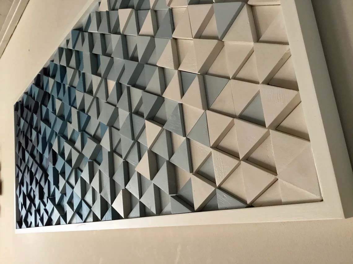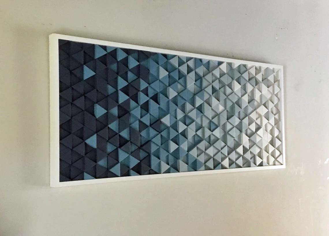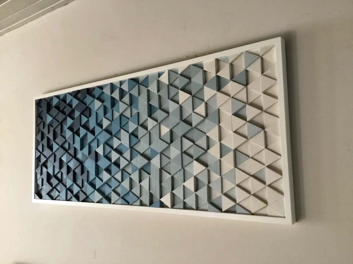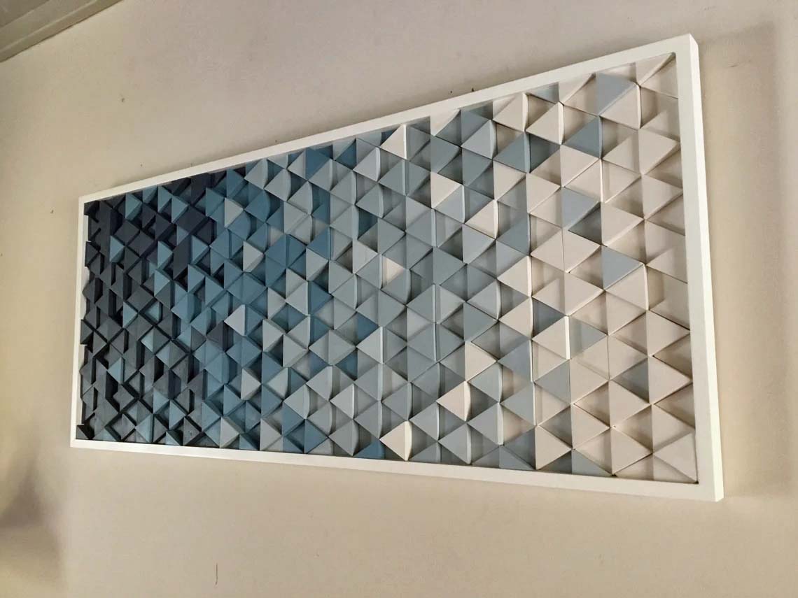 This beautiful geometric wood wall sculpture is composed of multi dimensional cut triangles placed into the design and colored with gradient trickling fade incorporating a series of blue color tones and white and also finished with a handcrafted crisp white frame. This piece could also be customized in regards to size and color modification. Feel free to contact.