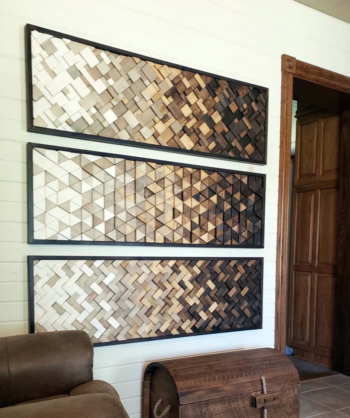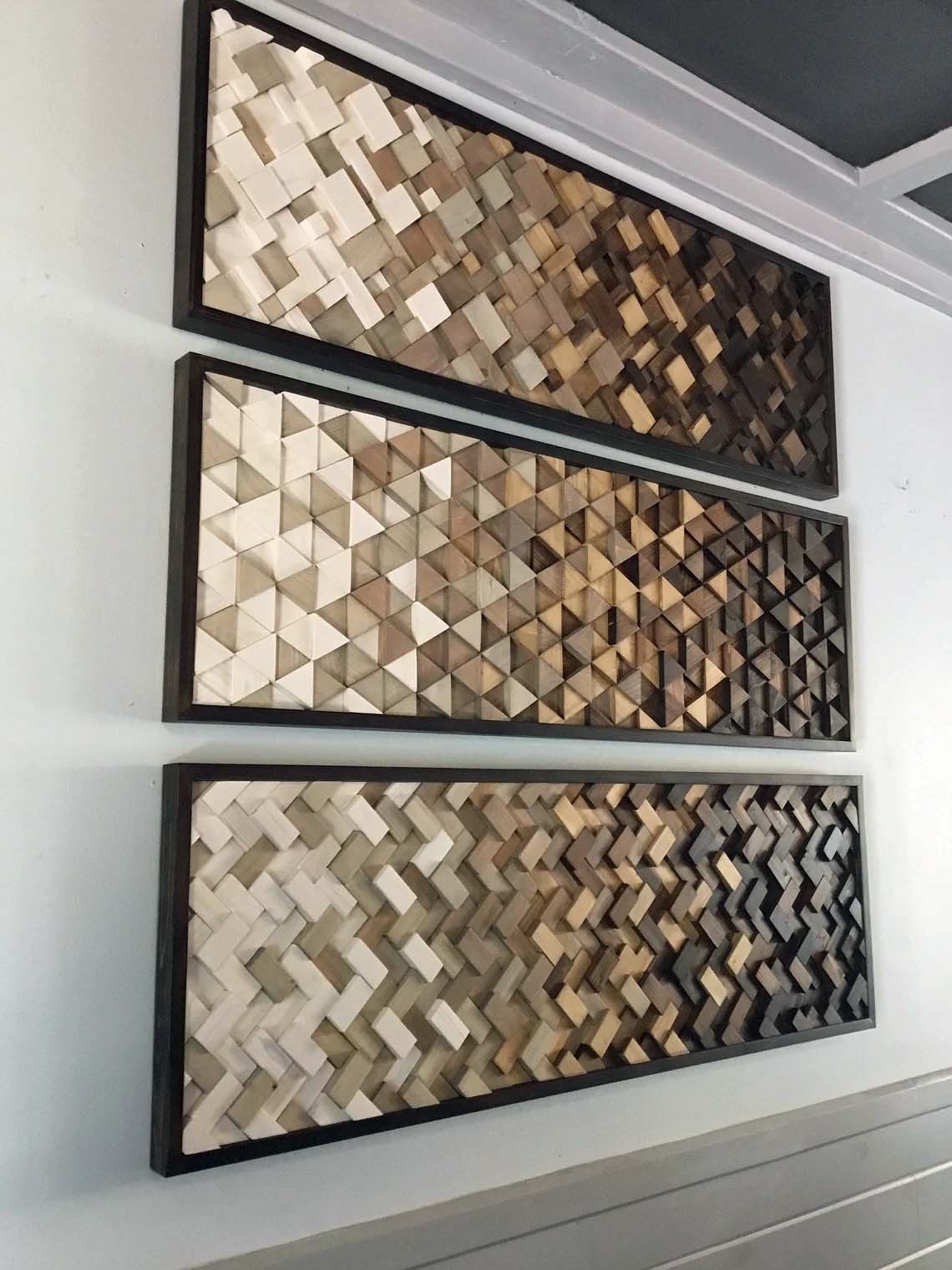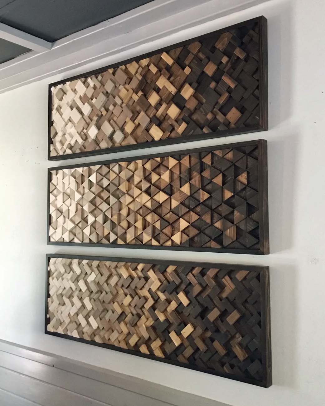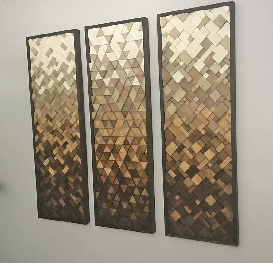 This amazing 3 panel set incorporates 3 separate multi dimensional design patterns ( herringbone, triangles and fractioned squares). All three have the same cohesive gradient trickling fade through multi tones of natural browns and grays ending in white measuring a total display size of roughly 4ft x 5ft. depending on display orientation ( see lineup photos for both options).
