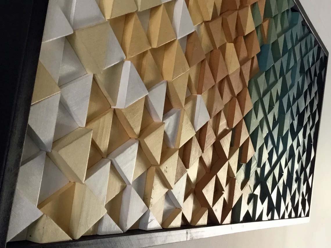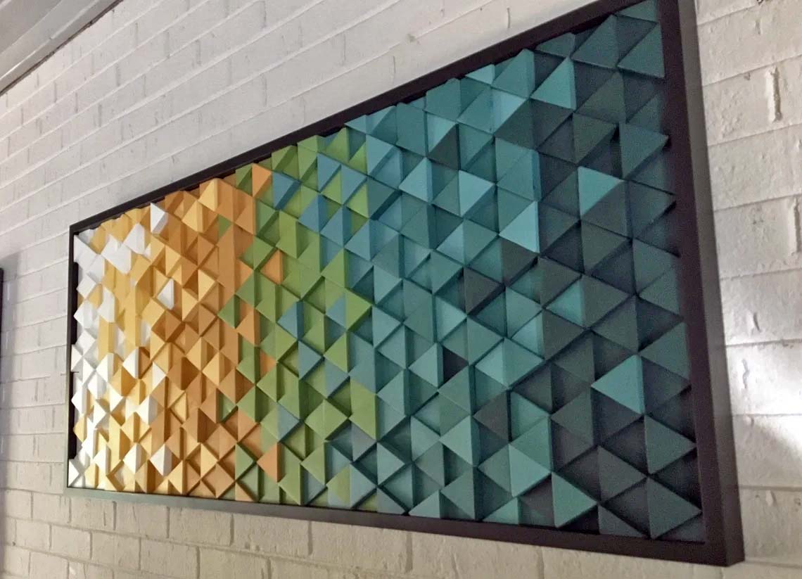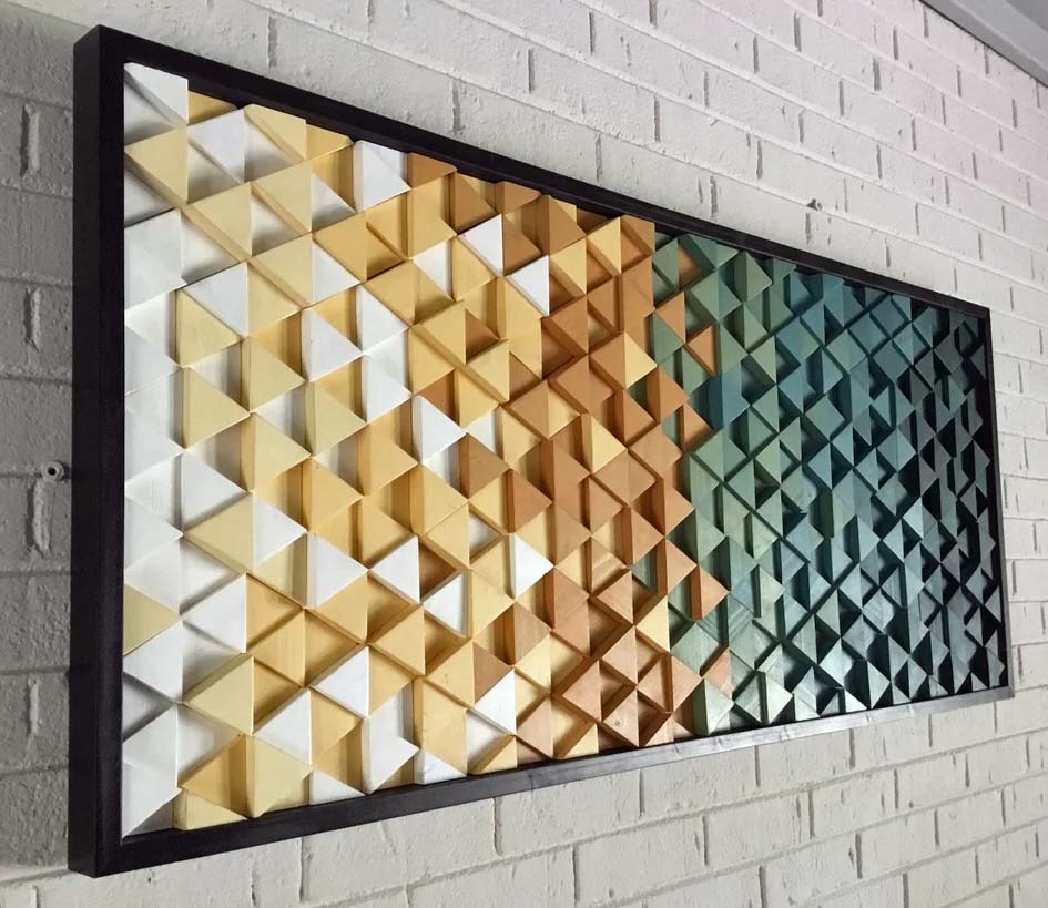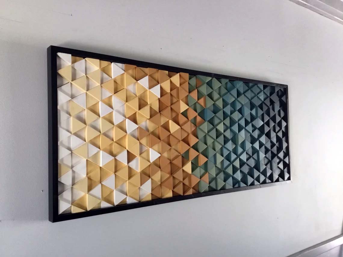 This beautiful geometric wood wall sculpture is composed of multi dimensional cut triangles placed into the design and colored with gradient fade in tones of blue, green, orange, yellow and white also finished with a handcrafted stained black frame. This piece could also be customized in regards to size and color modification as well. Feel free to contact.