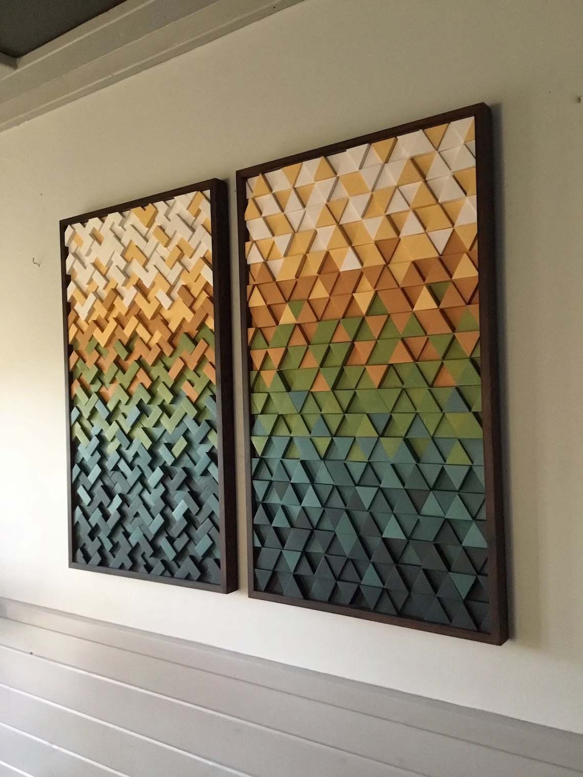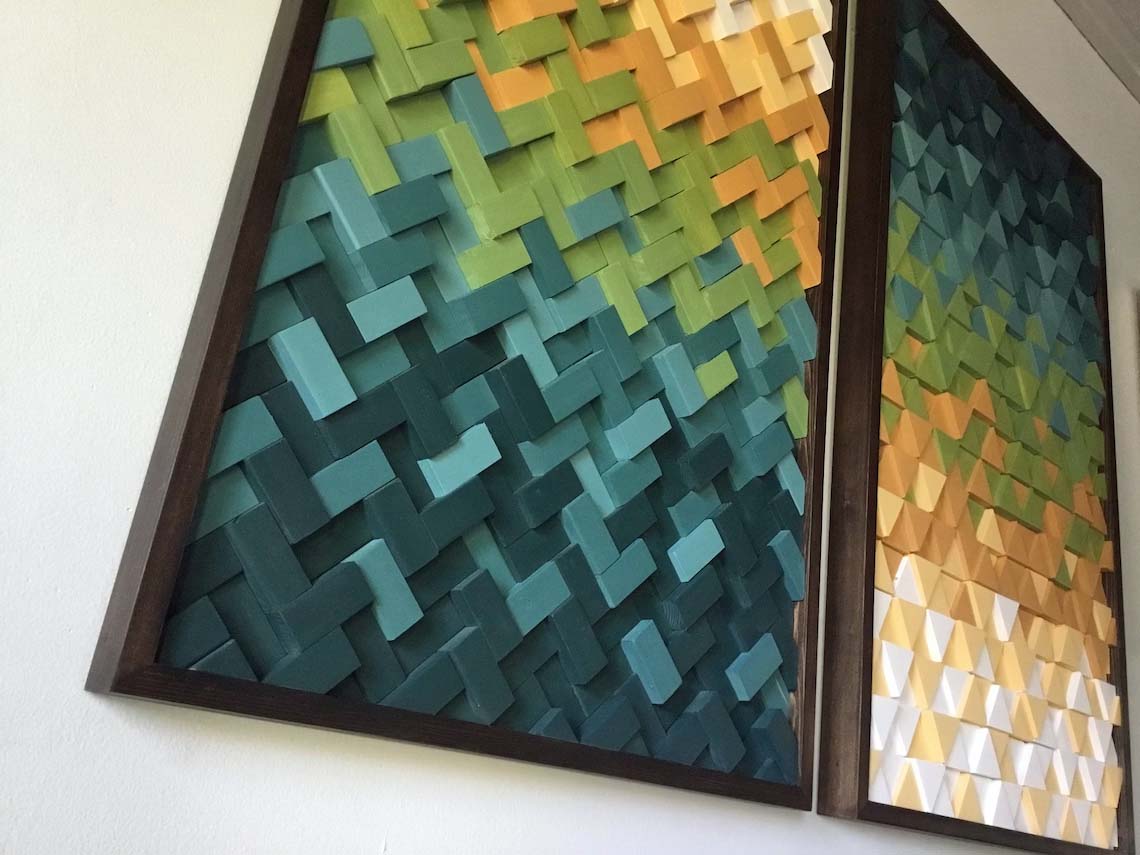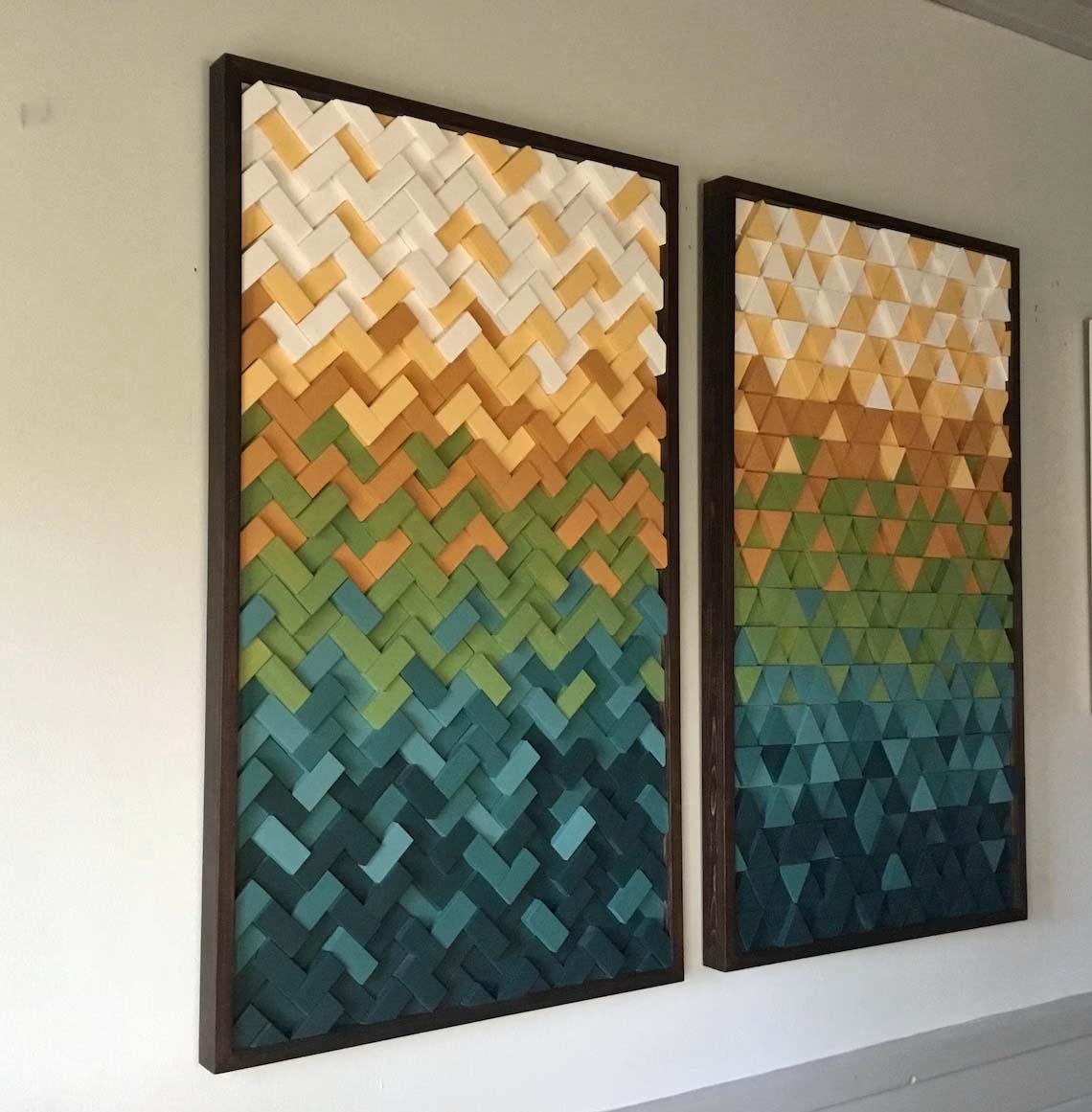 This handcrafted 2pc set includes 1 herringbone design sculpture and 1 triangle design sculpture both incorporating gradient tones of blue, green, orange, yellow and white, finished off with handmade frames in expresso wood tone? These 2 designs are fully customizable in size and color tones as well, feel free to contact with any questions you may have.