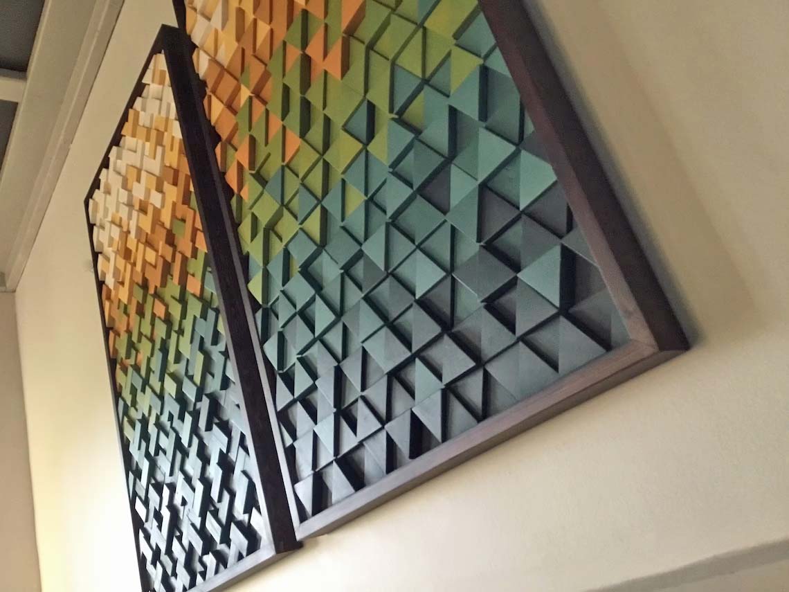 This beautiful geometric wood wall sculpture is composed of multi dimensional cut triangles and rectangles placed into the design and colored with gradient blue tones.