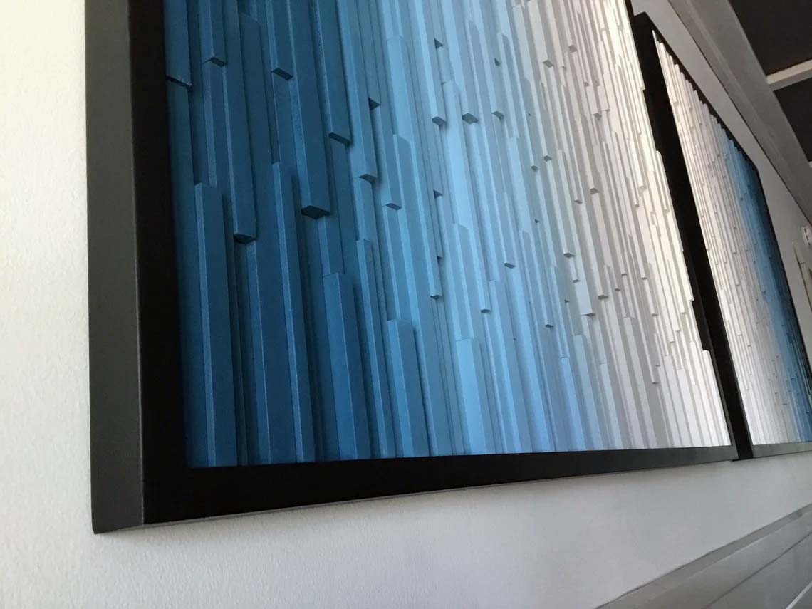 Handcrafted modern two piece wood wall art sculpture that is made from reclaimed and upcycled wood. To achieve this sculpture each piece of wood had to be individually ripped, cut, sanded, painted and assembled. This piece would be the focal point of any space whether it be home or office.