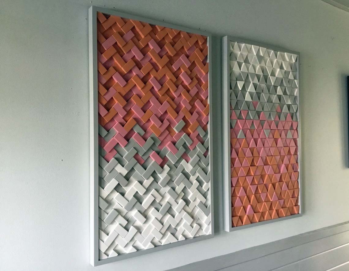 This handcrafted 2pc set includes 1 herringbone design sculpture and 1 triangle design sculpture both incorporating color tones of orange,pink, gray and white, finished off with handmade gray painted frames. These designs are fully customizable in size and color tones as well, feel free to contact with any questions you may have.